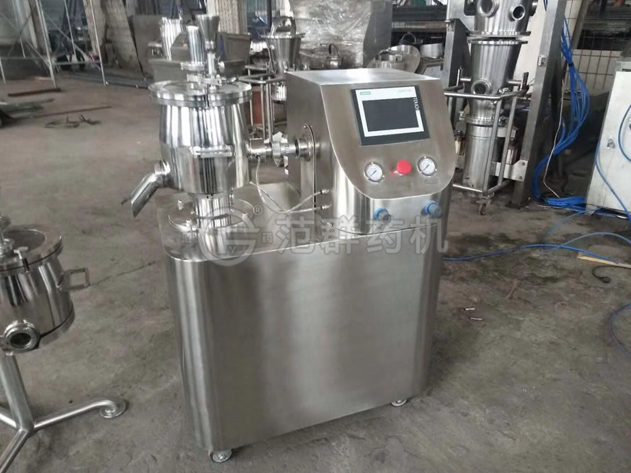 粉體物料與粘合劑在圓筒形容器中由底部混合槳充分混合成濕潤軟材,然后由側(cè)置的高速粉碎槳切割成均勻的濕顆粒。